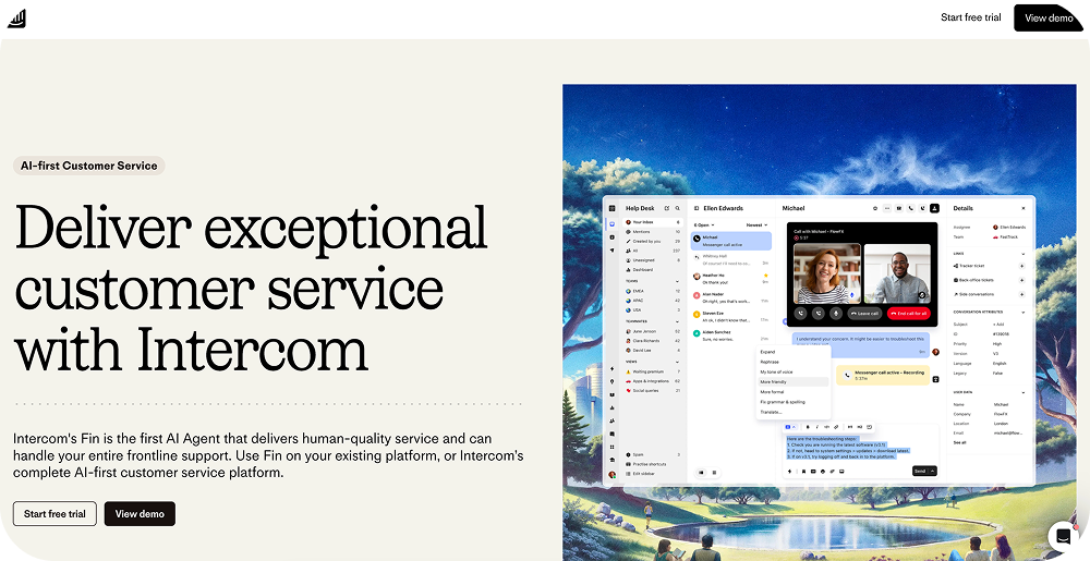 - Fin AI agent for autonomous ticket resolution